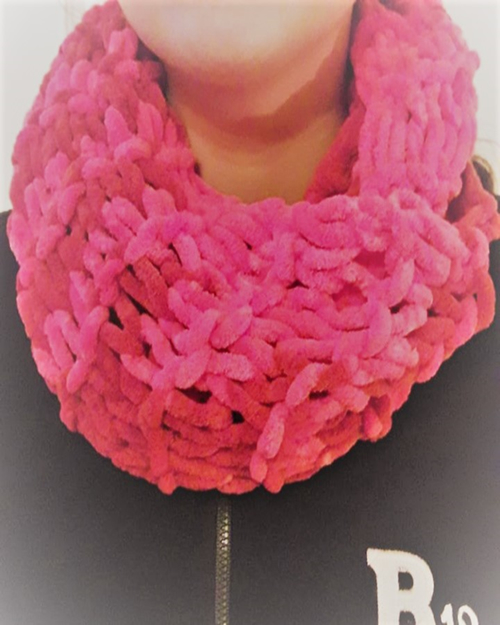 Bufanda cerrada tejida a 2 agujas con poliéster matizado, con textura aterciopelada, muy suave, la cual se puede lucir con una vuelta o 2 como en la imagen.