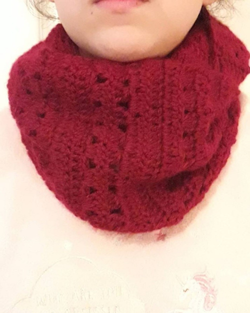 Bufanda cerrada tejida a crochet con lanas acrílicas, pero con textura suave, con algo de calado, para llevarla a 2 vueltas.