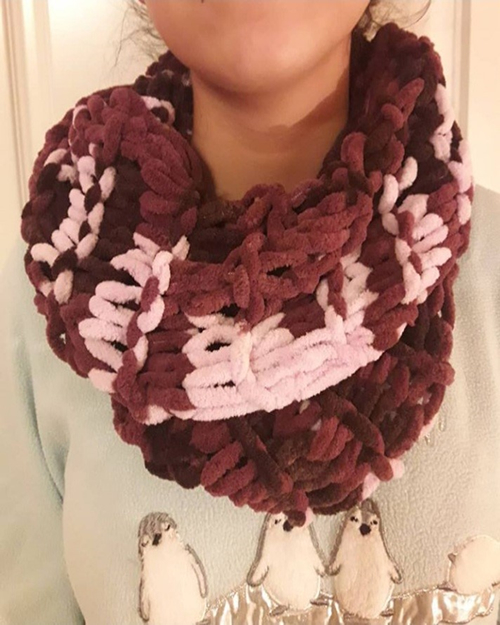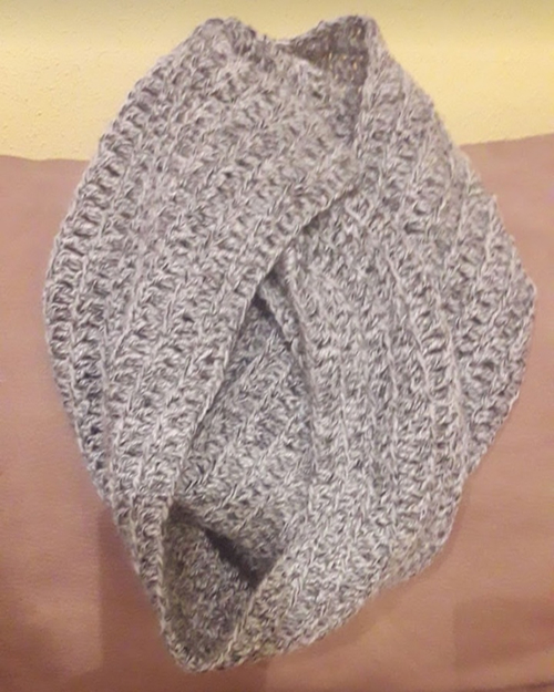 Bufanda cerrada tejida a crochet con lana 30% y 70% acrílica, con una textura muy suave e ideal para llevarla con 2 o 3 vueltas.