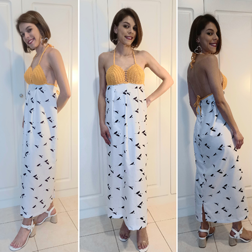 Vestido confeccionado con corpiño tejido a crochet, con algodón egipcio 100%, color amarillo canario, y cuerpo con tela popelín blanca, con estampado de aves en vuelo, color negro.